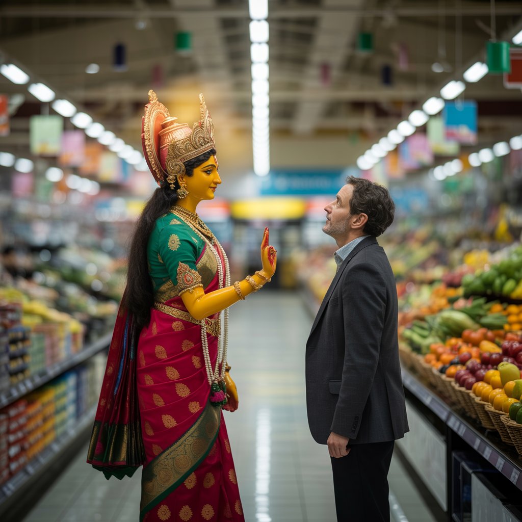 Still, when Ma Durga 'found' me, I was overcome by several feelings at once, love, acceptance, and reassurance. I expected wrath, but got deep love. I also knew I was totally safe with her, protected, and that all my troubles were solved and no longer as important as I had thought they were. So I was eager and readily able to hop down and follow her out of the store. Happily returning to everyday life and then, transcending the world, protected by the Goddess, I suddenly awoke with this realization deeply embedded in my consciousness.